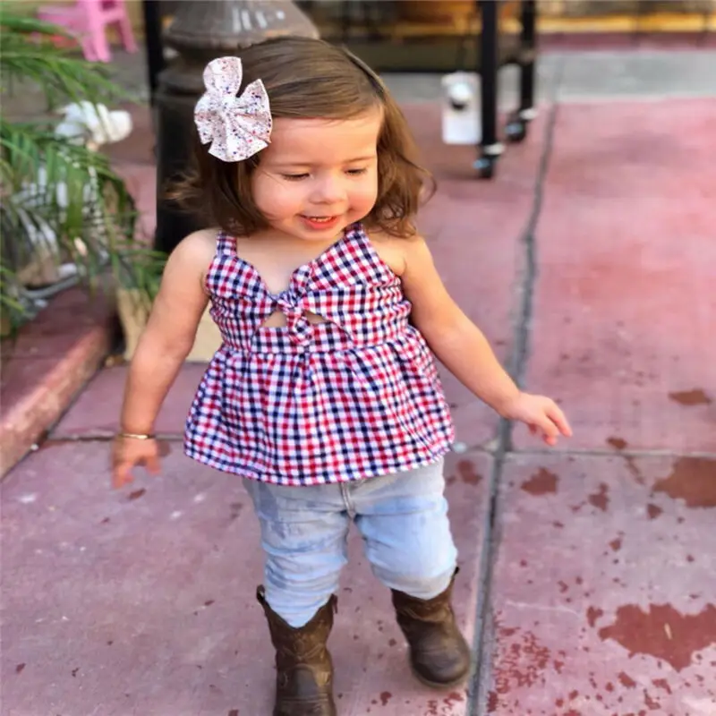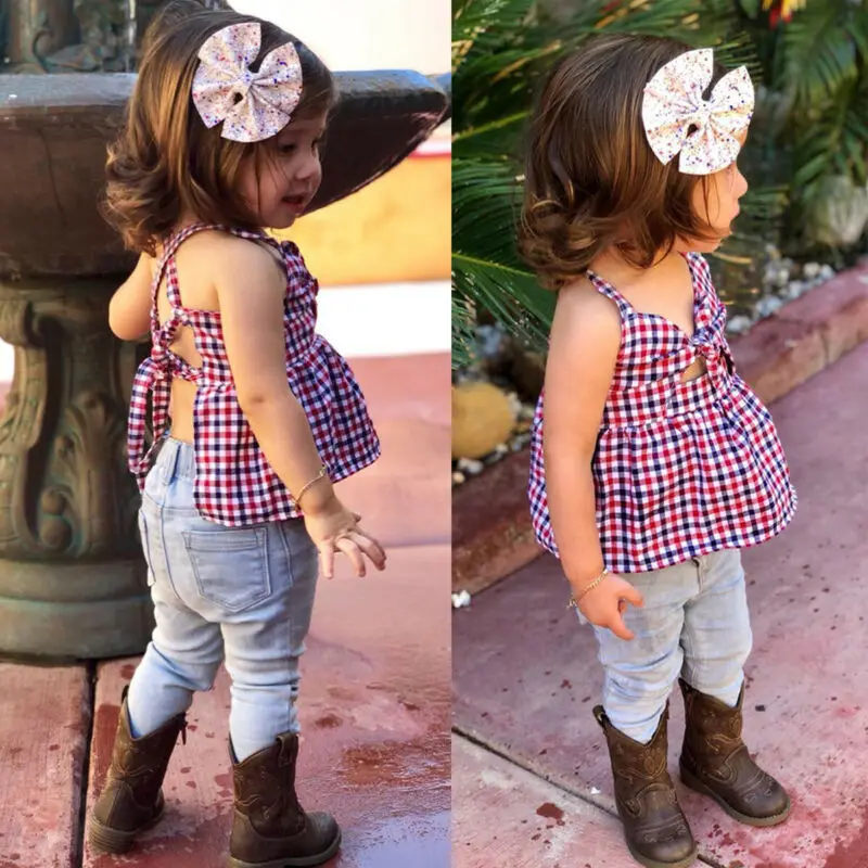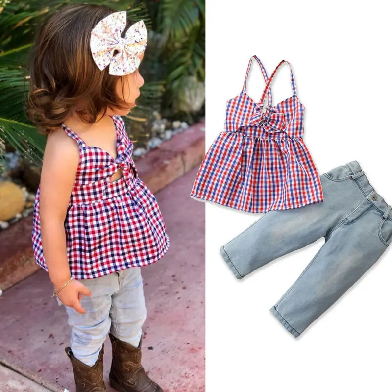 Special Chance of Baby Girl Cute Clothing Set Plaid Toddler Kid Baby Girl Clothes Bow Top T-shirt Jeans Pant 2pcs Out